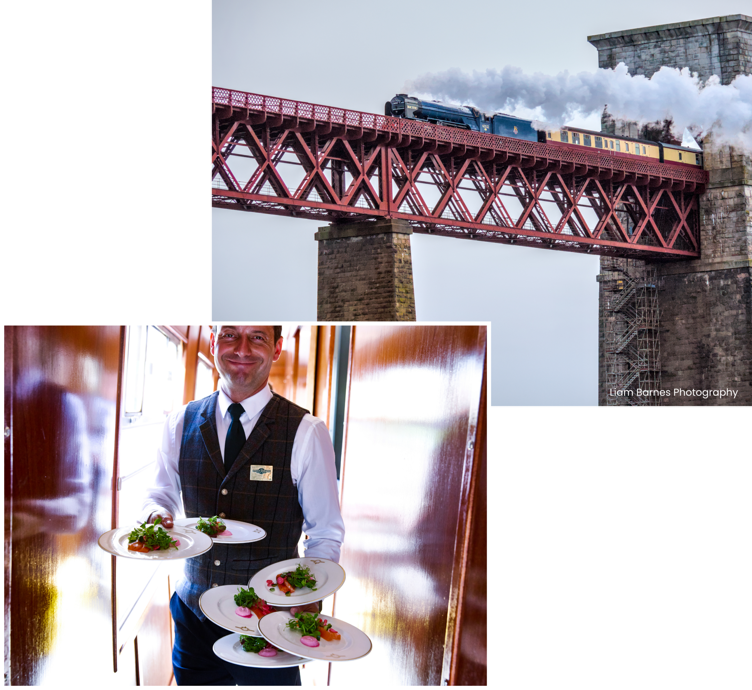 On a half‑day journey, guests are welcomed on board with our signature Champagne cocktail, followed by a seasonal carte du jour, and concluding with coffee and petit fours.