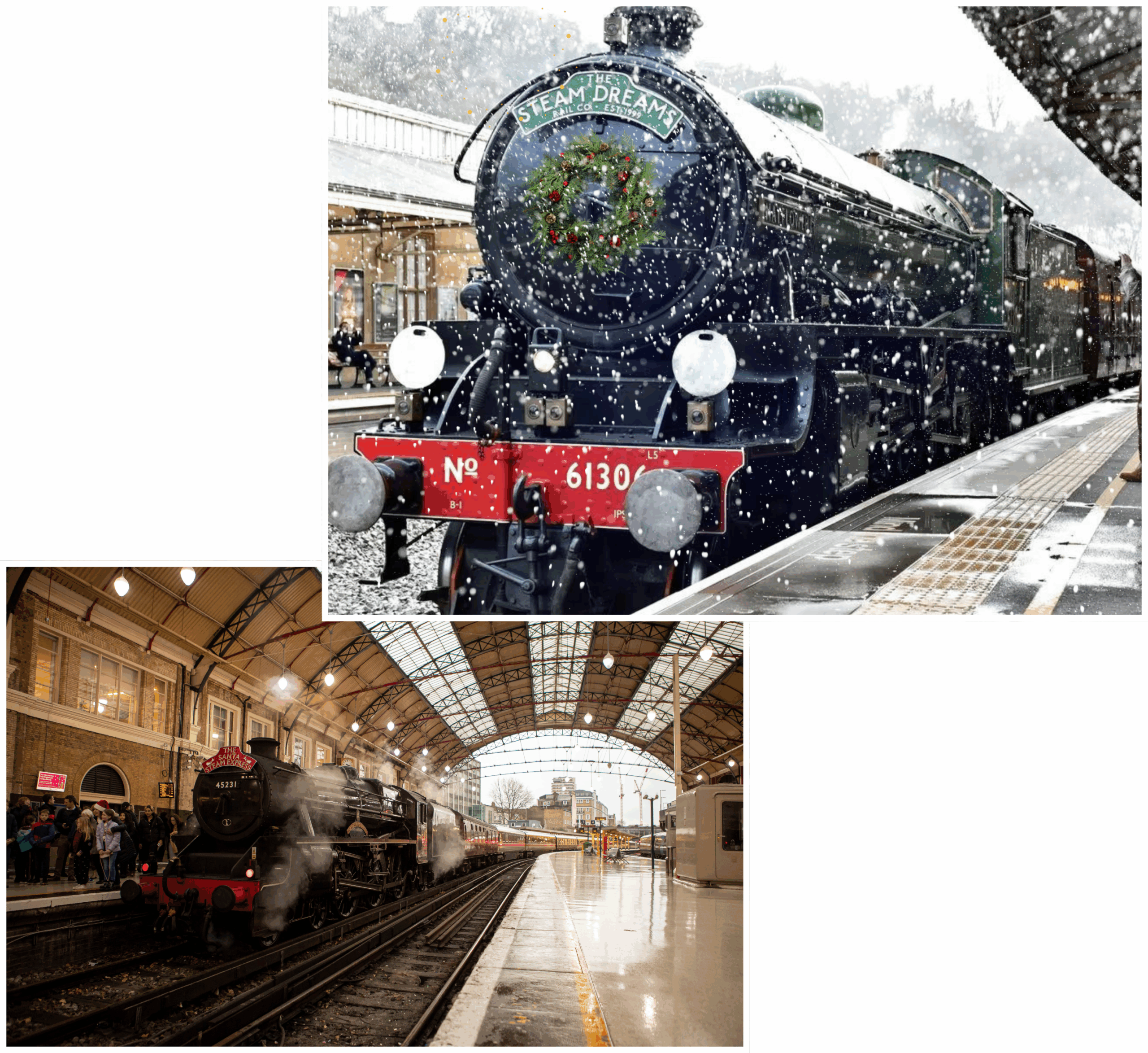 Sink into cushioned seating around spacious tables for four or two and admire your festively adorned 1950s or 1960s carriage, with finishing touches including vintage table lamps and curtains. Santa and his merry elves will make a special appearance during the journey bringing a gift for every child.